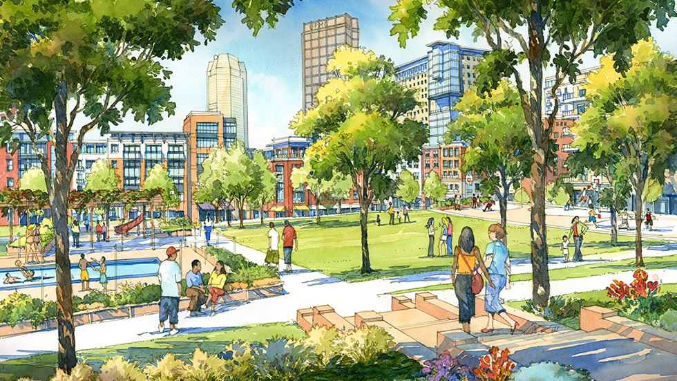 The Pittsburgh Penguins, who have the development rights to the property, prepared the initial redevelopment plan in 2010 with the assistance of Urban Design Associates, LBA, Trans Associates, and AECOM. The development program is based on market conditions that existed in February 2010. The Penguins are pursuing a Specially Planned District zoning designation for the entire site, allowing greater design flexibility and a higher density than typically permitted. The goal is to create a vibrant mixed-use neighborhood that takes full advantage of this unique downtown location.